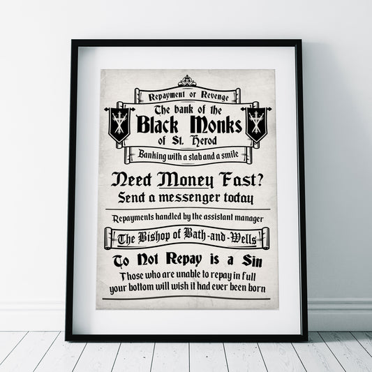 BANK OF THE BLACK MONKS Money Lending Advert, Blackadder Print