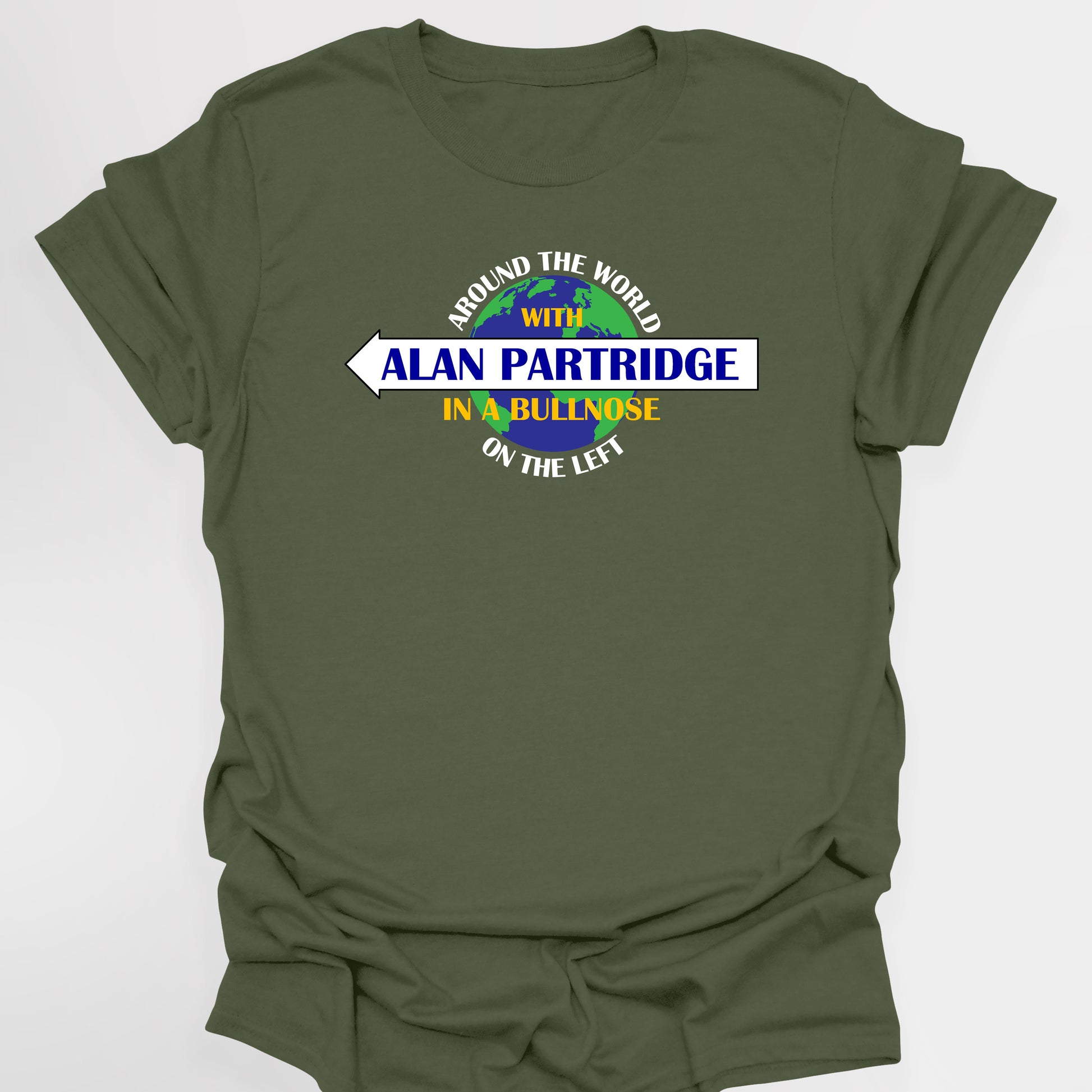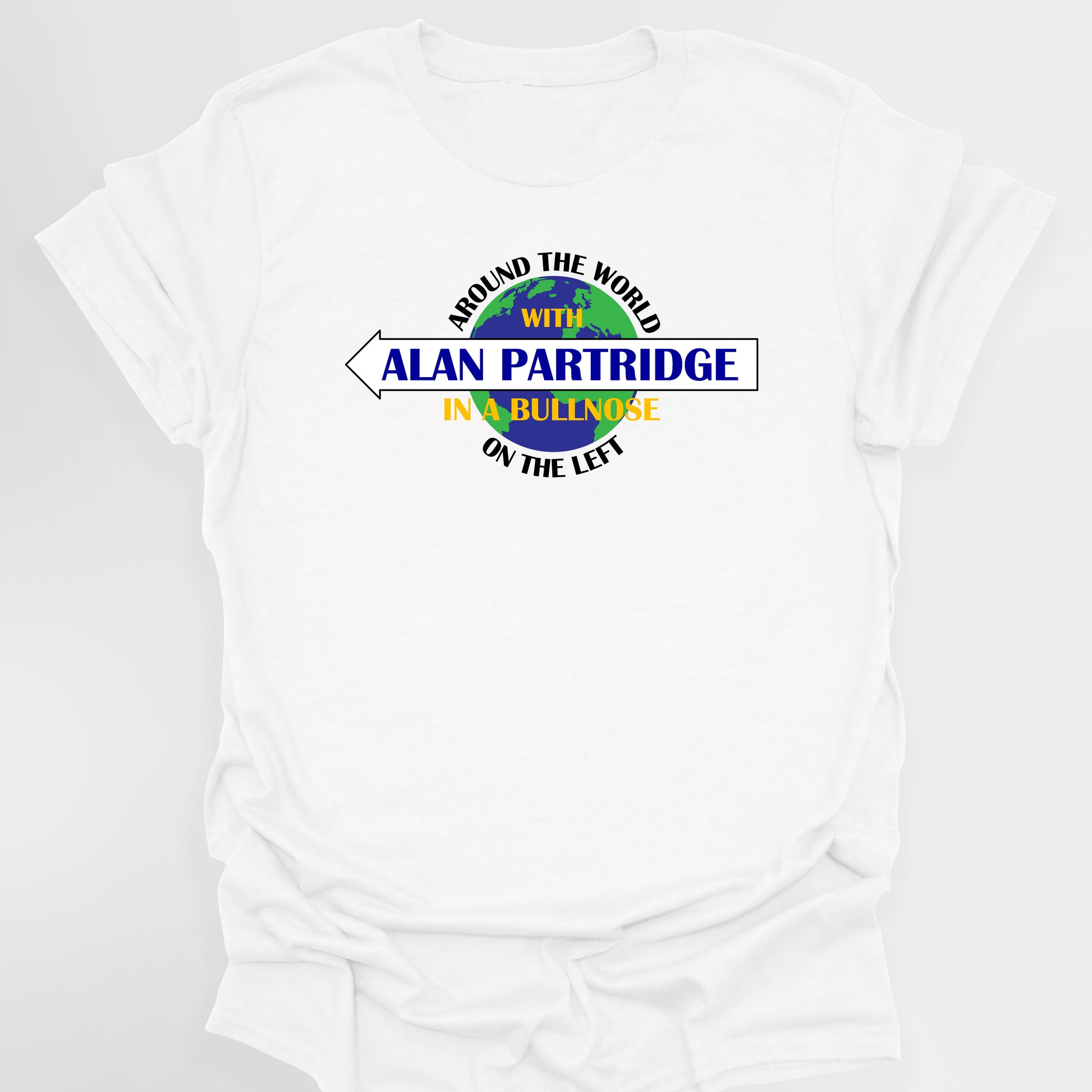 Alan Partridge had many ideas for a TV show, more often than not, they would be ones that wouldn't quite appeal to the TV producers. Around the World With Alan Partridge, In A Bullnose On The Left, to give it the full title was one of those classic ideas that has inspired this design, imagining what the logo for this fictional show may look like. This t-shirt is sure to have you standing out in a crowd, but would equally make for an ideal gift for any fan of this classic show.