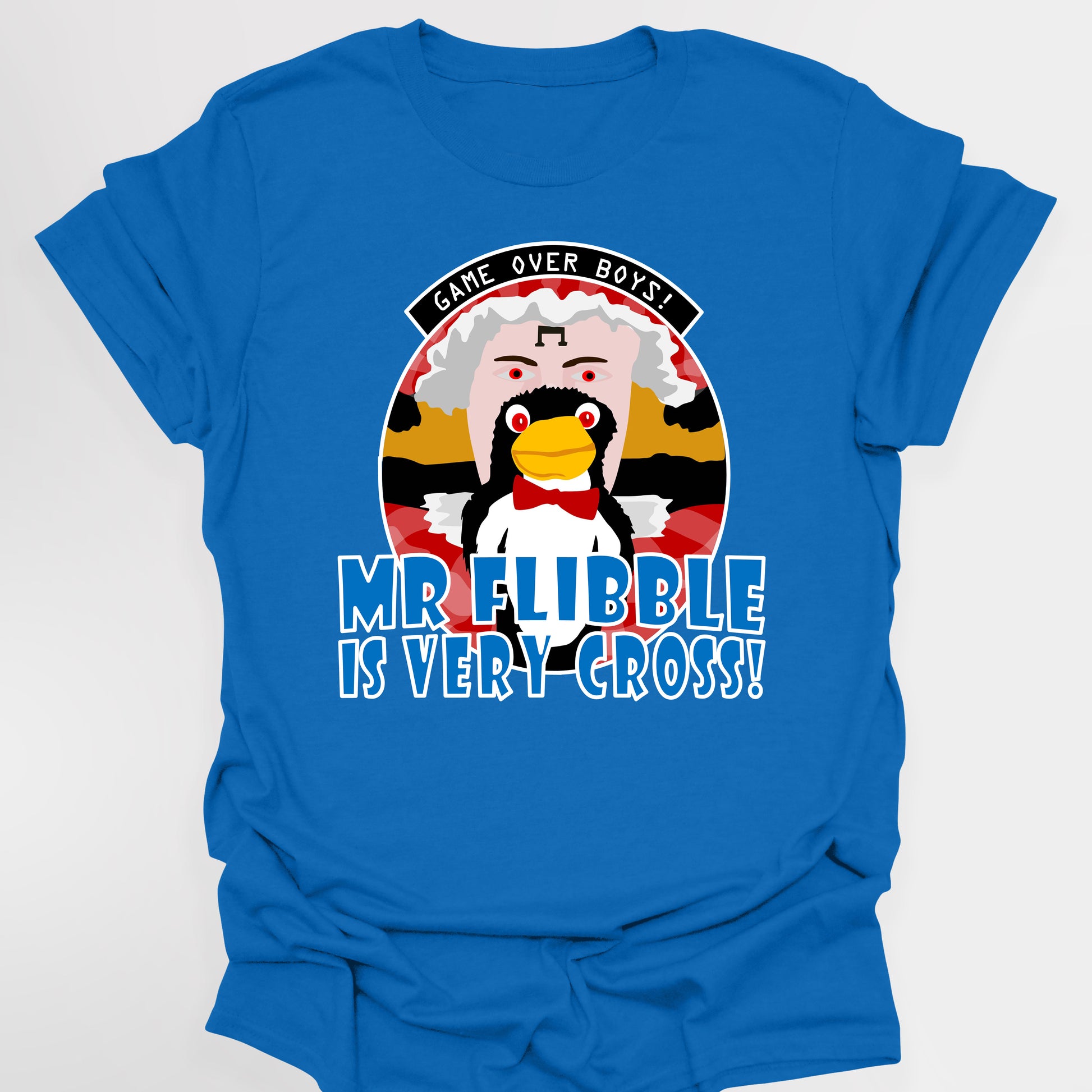 This exclusive design features Rimmer in the iconic gingham dress, from the episode 'Quarantine' along with his side-kick penguin puppet known as 'MR FLIBBLE'. He may be very cross, but it's not game over with this t-shirt that's sure to have you standing out in a crowd, but would equally make for an ideal gift for any fan of this memorable show.