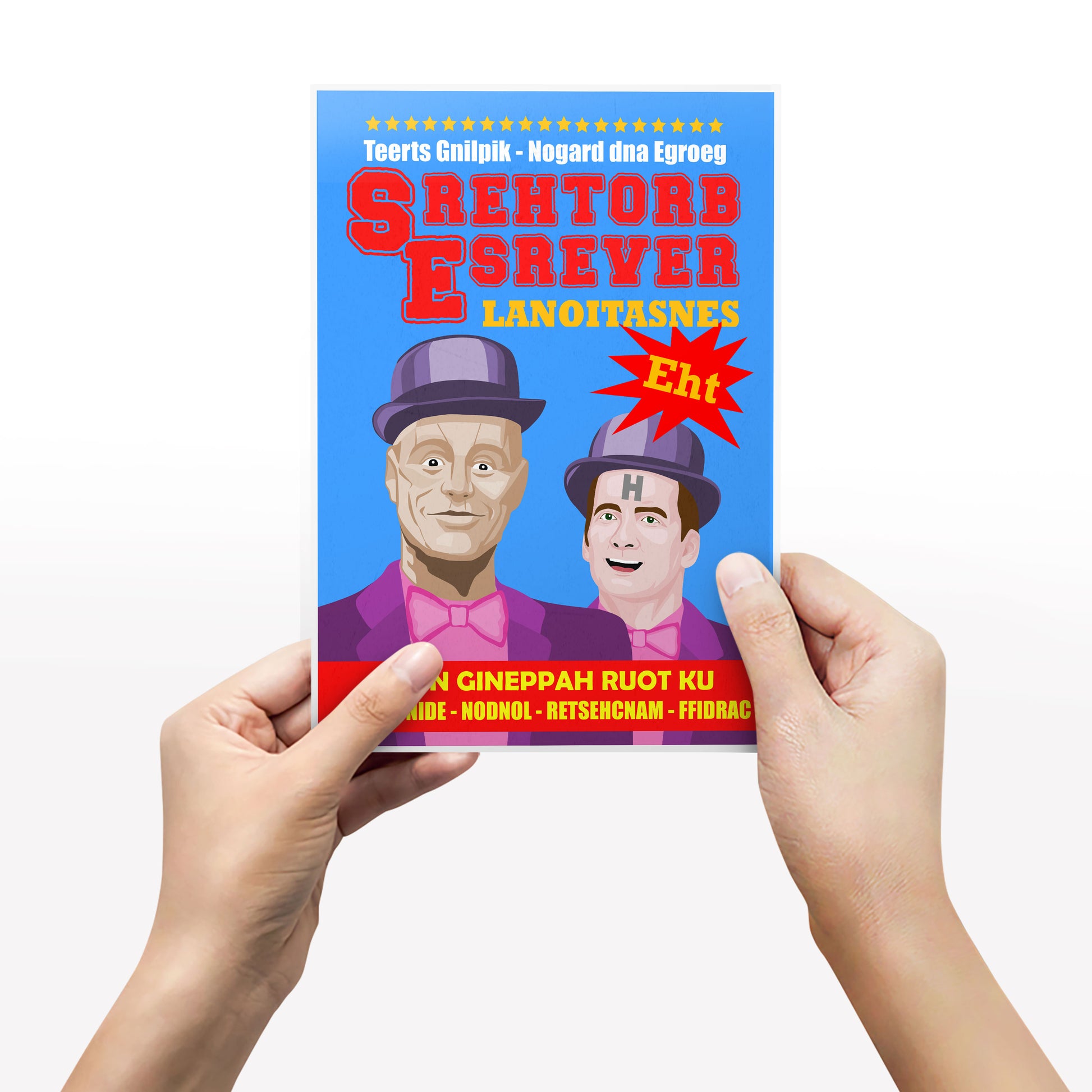 This exclusive design is our recreation of the poster from the classic Red Dwarf episode 'Backwards' where Kryten and Rimmer decided to become 'The Sensational Reverse Brothers' or rather ' Srehtorb Esrever Lanoitasnes Eht'. Illustrating them in their purple outfits as they embark on a tour including such places as Nodnol. This unique poster style print not only looks amazing, but would make an ideal gift for any fan of this memorable show.